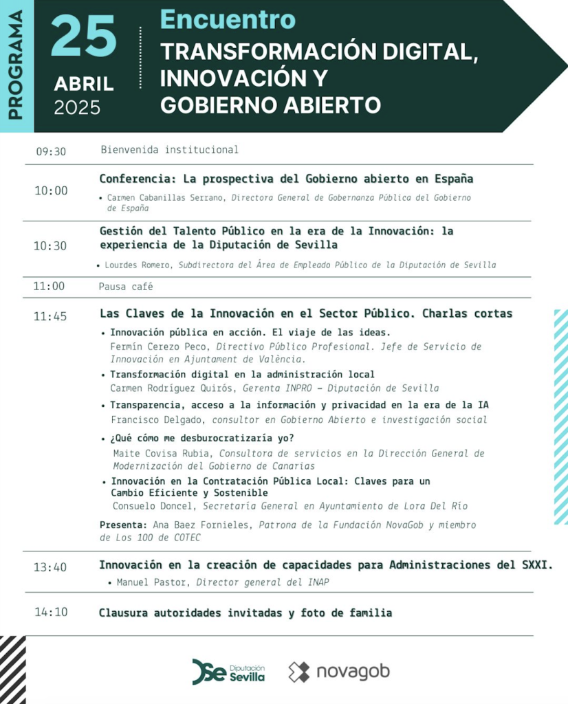 - 09:30 – Bienvenida institucional: La apertura del evento contará con la participación de autoridades de la Diputación de Sevilla y representantes de la Fundación NovaGob, quienes destacarán la importancia de la innovación y la colaboración en la administración pública.