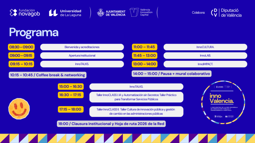 - InnoTALKS: Intervenciones breves sobre inteligencia artificial con propósito público, la relación entre ciencia y política y la confianza institucional basada en datos abiertos. Contará con participantes como Ana Guerra (Generalitat de Cataluña), Borja Colón, y María Jesús Langa (Diputación de Valencia).