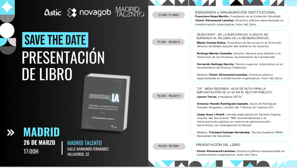 Tras su aclamada presentación en Barcelona, el libro BurocracIA, escrito por Víctor Almonacid Lamelas, desembarca en Madrid el próximo 26 de marzo. Este evento se llevará a cabo en la sede de Madrid Talento, en colaboración de Astic, y reunirá personas referentes en administración pública, modernización y transformación digital para debatir sobre el impacto de la inteligencia artificial en la gestión pública y el futuro de la burocracia.